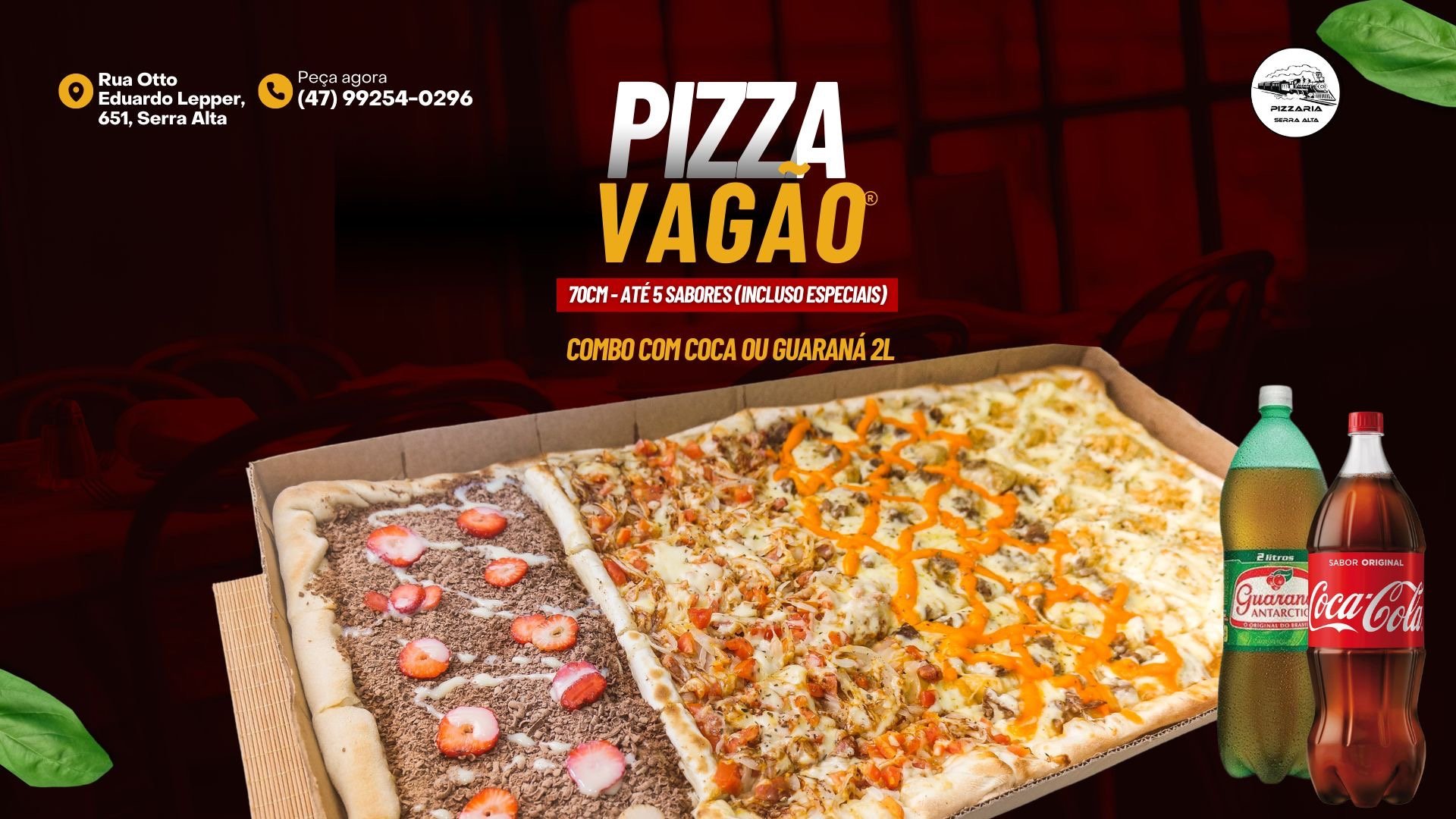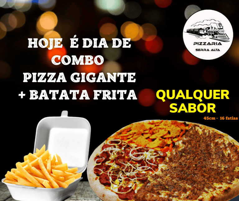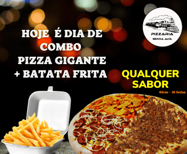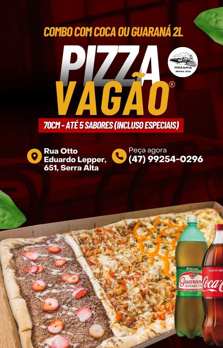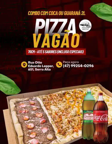 Descubra as deliciosas pizzas da Pizzaria Serra Alta, localizada no bairro Serra Alta em São Bento do Sul. Nosso cardápio conta com preço único, perfeito para quem ama qualidade e praticidade. O destaque fica por conta da incrível Pizza Vagão, com impressionantes 70 cm, ideal para compartilhar momentos especiais com amigos e família. Venha saborear nossas pizzas e vivenciar uma experiência única de sabor e tradição